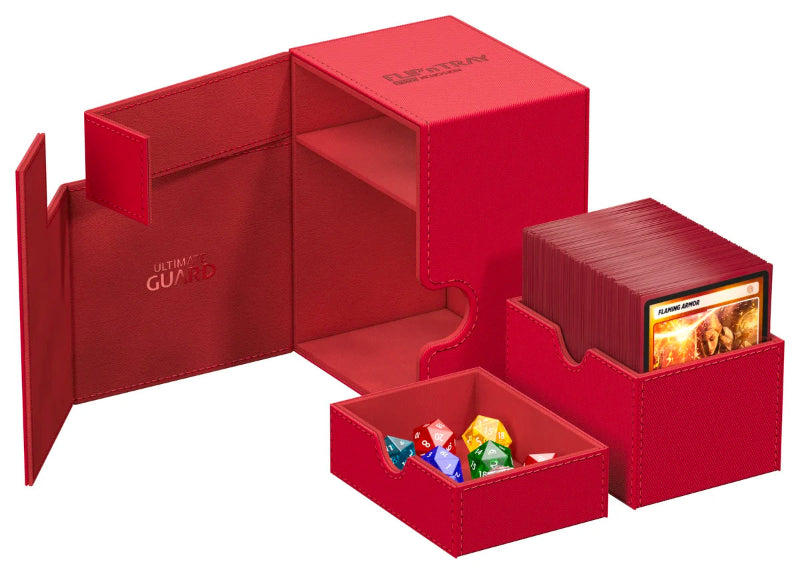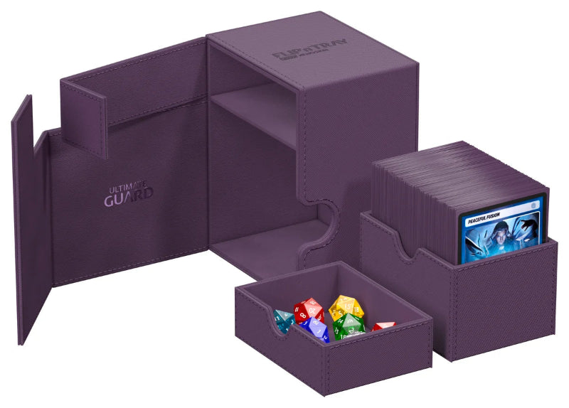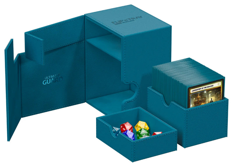 The Ultimate Guard Flip'n'Tray 133+ securely stores up to 133 double-sleeved or 160 single-sleeved cards, with removable trays for dice and accessories, a strong magnetic closure, and a durable Xenoskin exterior.