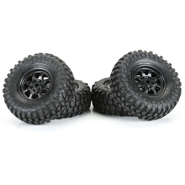 Built for the toughest lines, this pre mounted tire and wheel set gives your SCX30 instant traction, style, and convenience. The officially licensed BFGoodrich Krawler T A KX tire brings its iconic aggressive tread and sticky compound to the 1x30 scale, delivering confident grip across rock, dirt, and uneven terrain. Mounted on Black Icon Nuevo wheels, the combo installs in seconds with no glue and no prep, giving your crawler a bold, ready for anything stance. Perfect fitment for the Axial SCX30 means true bolt on simplicity with pro level performance.